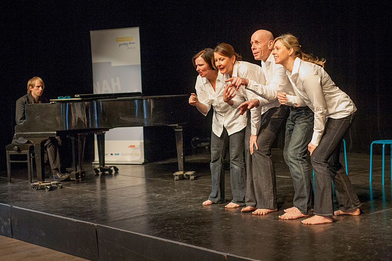KALEIDOSKOP führt durch den Tag – nur am Ende stellen die Teilnehmenden die Eindrücke und Erkenntnisse ihrer Workshops selbst in Standbildern auf der Bühne dar.