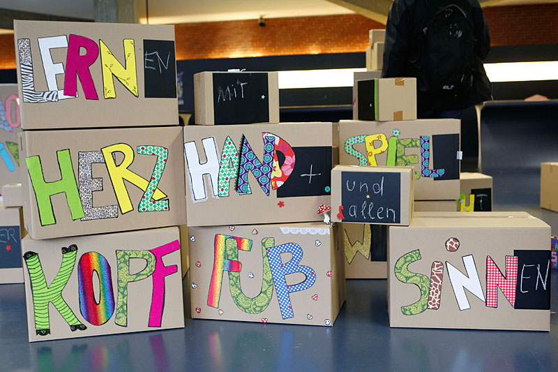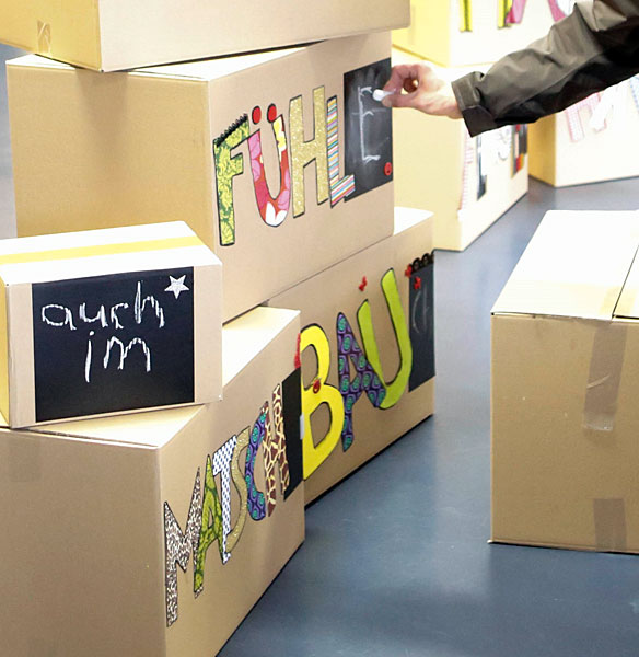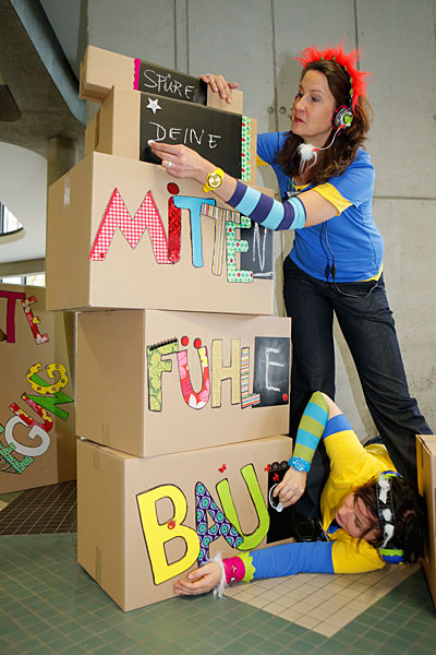 Auf farbenfrohen, kunstvoll gestalteten Kartons finden sich Worte wie Herz oder Matsch oder Spunk, aus denen die PädagogInnen engagiert ganze Sätze formulieren. Wer sich hier aktiv beteiligt, bekommt eine besondere Belohnung: der eigene Name wird getanzt.