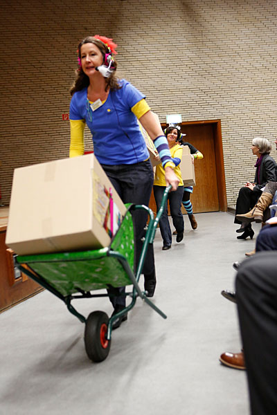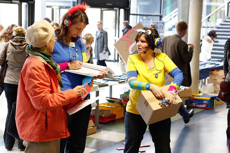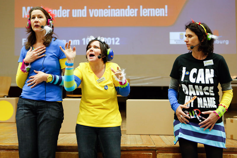 So begrüßen die Mitarbeiterinnen vom BND (BehördenNotDienst!) viele der ca. 600 Leitungskräfte und ErzieherInnen, AusbilderInnen und Studierenden im Audimax der Uni Hamburg und laden sie dazu ein, Wörter zu bewegen!